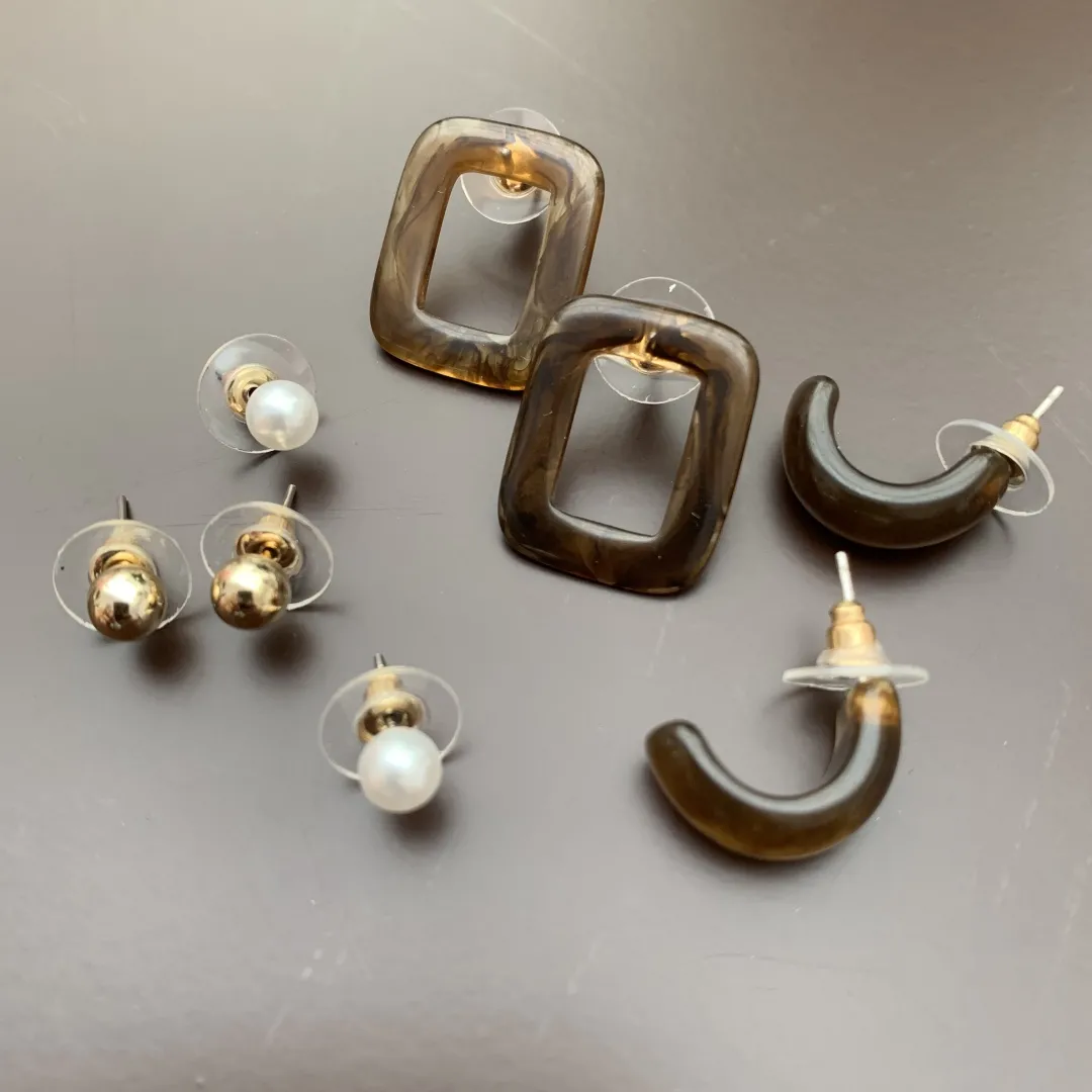 第一个是这种套组式耳钉,一套有四对,两副形状不同的亚克力材质耳钉,还有一对珍珠和一对金属的基础款小耳钉,如果你耳洞多的话还可以叠戴。我买了两种颜色,一套的价格才6.8,确实是蛮便宜的。
